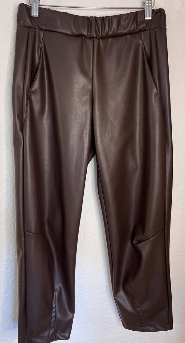 Die Kunstlederhose in edlem Schokobraun vereint Kompfort und Stil. Der sehr weiche, griffige Stoff fühlt sich angenehm auf der Haut an, während der elastische Bund und die lockere Passform für absolute Bewegungsfreiheit sorgen.